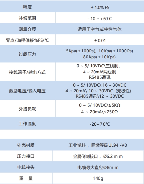 壓力傳感器可提供低至0~±50Pa,高至0~±10,000Pa的量程。靜態(tài)精度在常溫下為±1.0%FS,溫度補償范圍是-10~+60℃,在溫度補償范圍外的熱漂移小于0.05%FS/℃。LFM108采用進口壓力芯體,具有壓力反應靈敏、長期輸出穩(wěn)定、溫度性能優(yōu)越等特點。