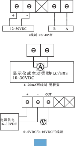LFM108可選擇電壓型(0~5/10VDC)和電流型(4~20mA)輸出方式。其中電壓型為三線制輸出,需按照標示接線;電流型為兩線制輸出,且無極性,可任意調換接線。輸出RS-485通訊信號,可選擇Modbus標準通訊協(xié)議或BACnet MS/TP通訊協(xié)議。Modbus標準通訊協(xié)議使用協(xié)議中0x03(讀保持寄存器)、0x06(寫單個寄存器)兩種功能碼,具體協(xié)議詳見《LFM108-Mod通訊協(xié)議》;BACnet MS/TP具體協(xié)議詳見《LFM108-BACnet通訊協(xié)議》。其中,排針為RS-485 A-B線匹配電阻跳線,當通訊距離超過300米時,可選擇將末端儀表跳線連接,以降低通訊電路信號反射干擾。